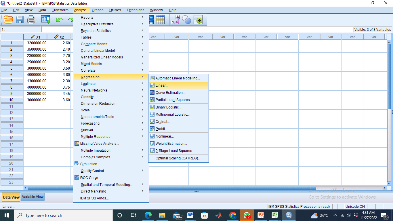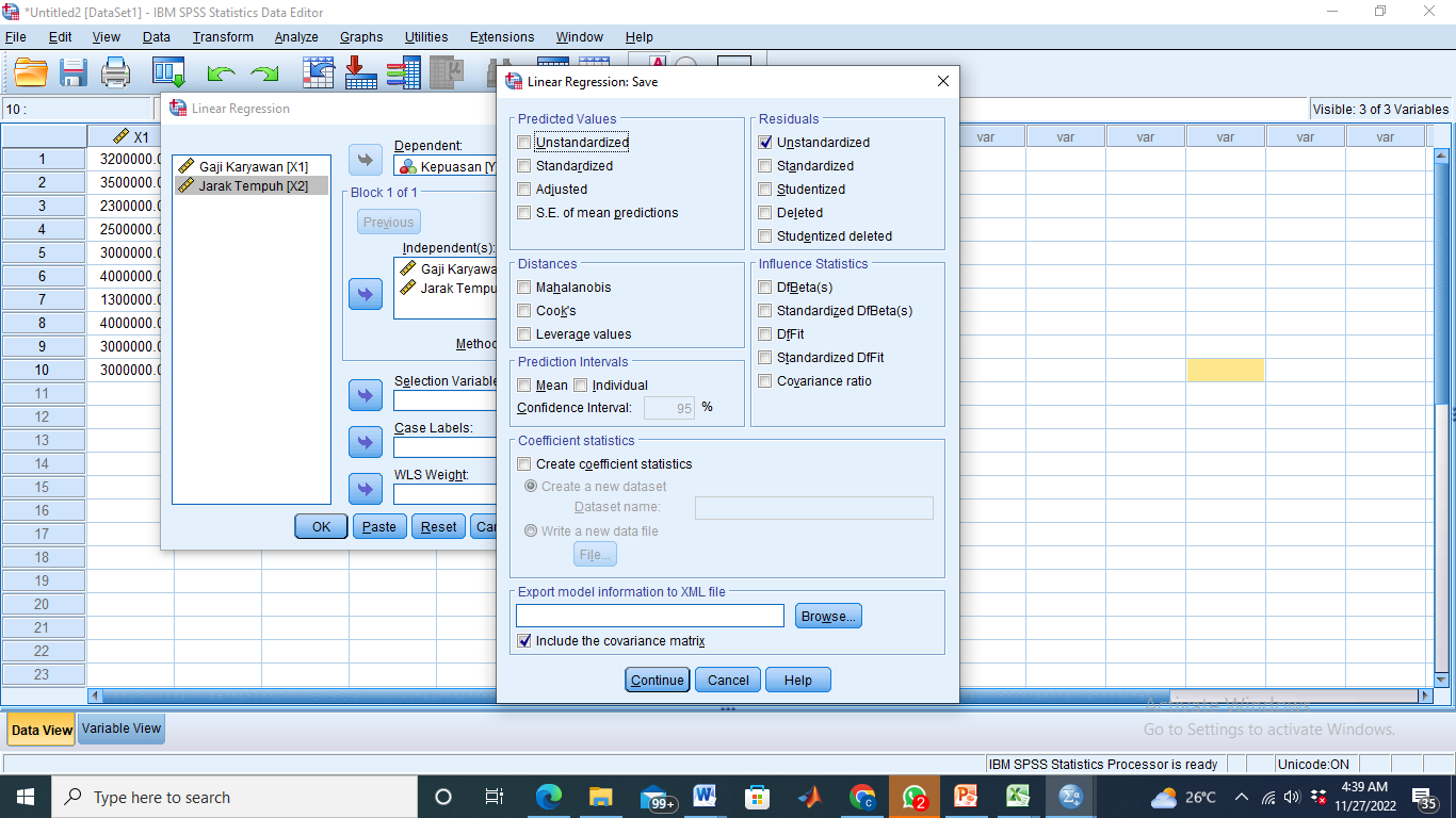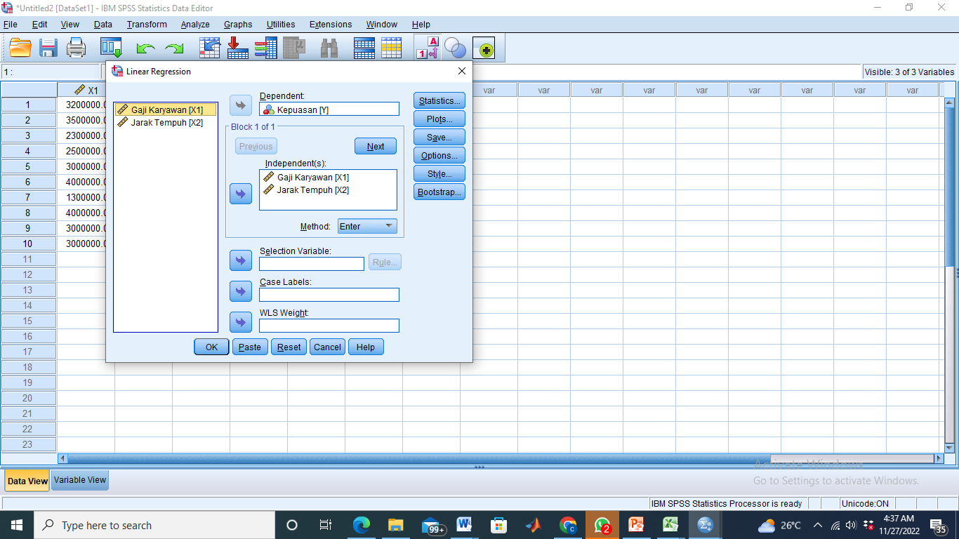 Masukkan Y ke kotak Dependent, X1 dan X2 ke kotak Independent(s)