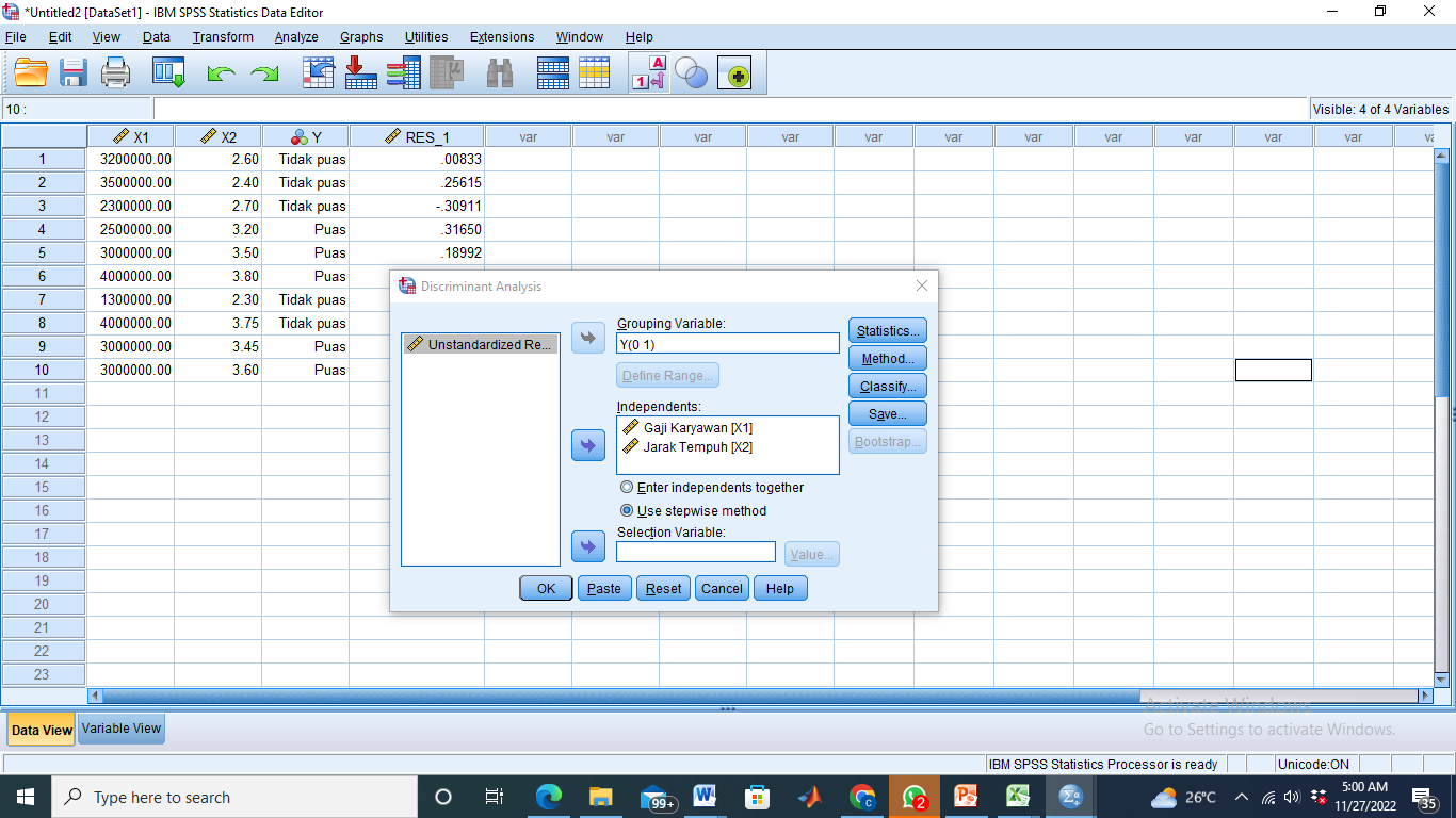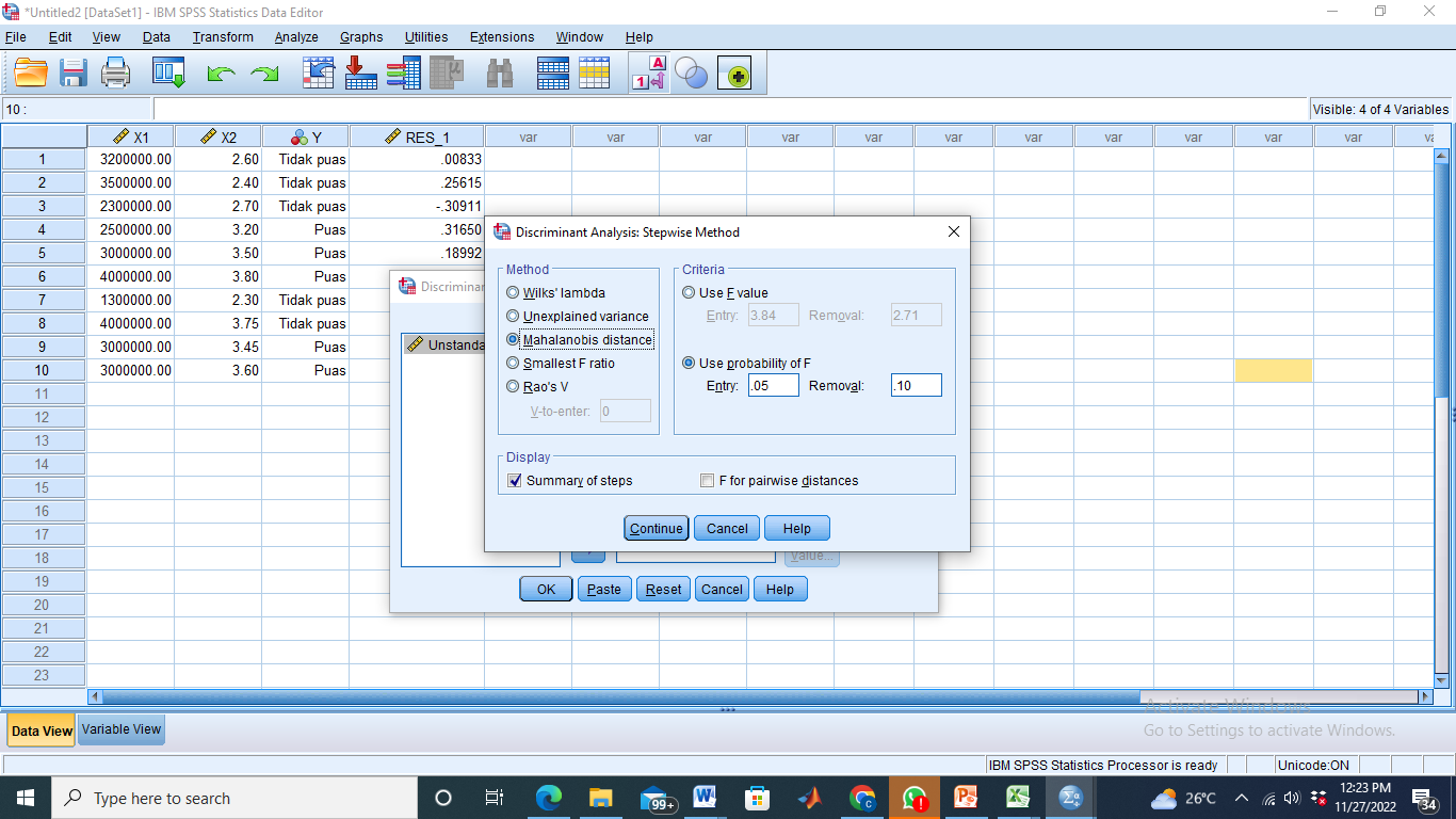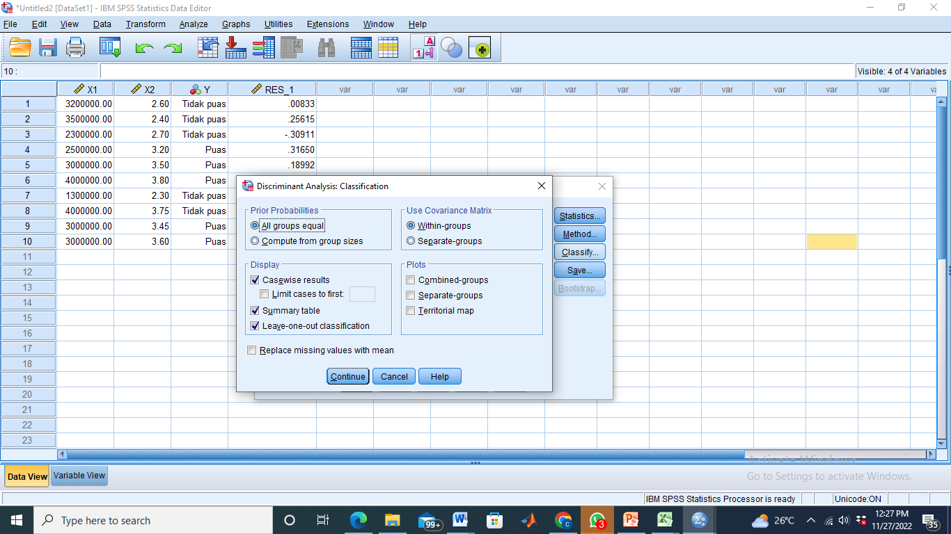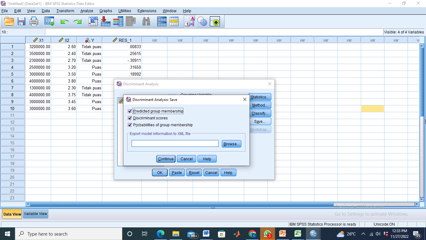 RES_1 pada gambar di atas merupakan residual dari data yang digunakan untuk mengetahui data terdistribusi normal atau tidak. Kolom-kolom disamping merupakan hasil dari Bagian proses Save. Melalui proses tersebut tampillah nilai-nilai posterior probability observasi untuk masuk ke kelompok kode nol (Dis1_2), nilai-nilai posterior probability observasi untuk masuk ke kelompok kode satu (Dis2_2), nilai-nilai discrimant score (Dis 1_1), dan pengklasifikasian observasi oleh model (Dis_1). Misalnya untuk observasi pertama, nilai peluangnya untuk masuk ke dalam kelompok kode nol (0.88990) lebih besar daripada peluangnya untuk masuk ke dalam kelompok kode satu (0.11010), maka observasi ini akan dimasukkan oleh model ke dalam kelompok kode nol.