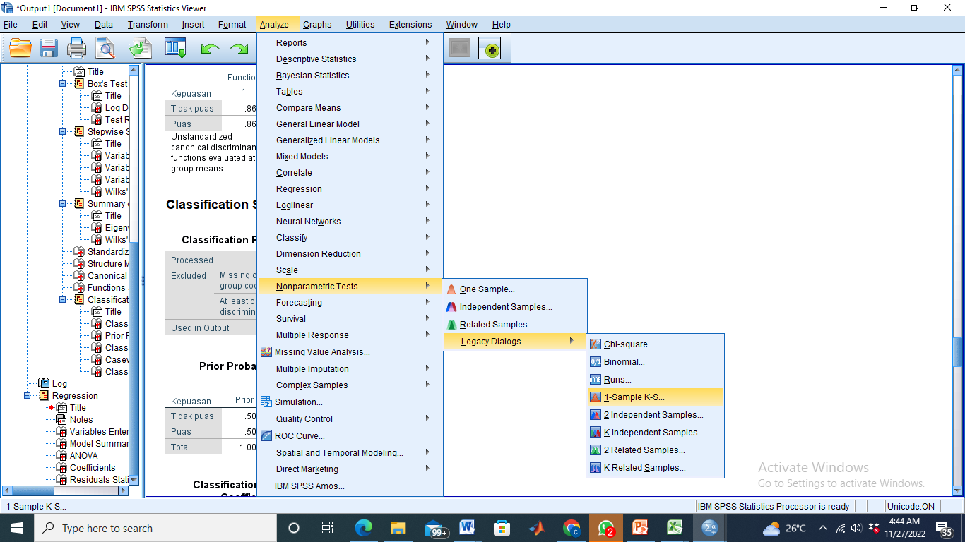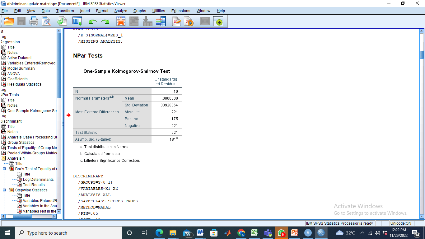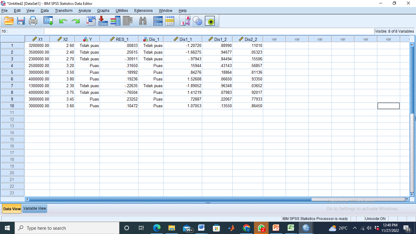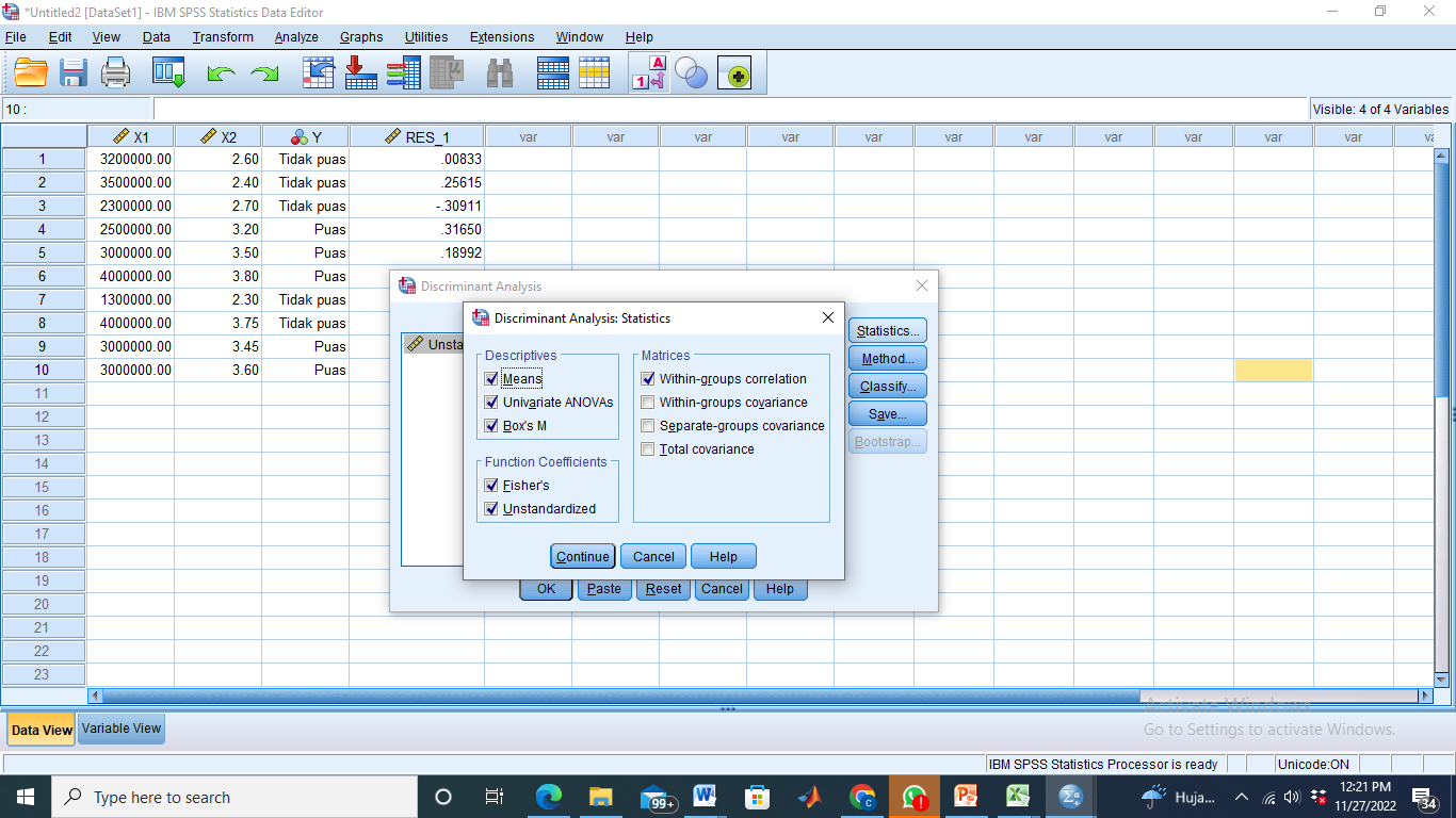 RES_1 pada gambar di atas merupakan residual dari data yang digunakan untuk mengetahui data terdistribusi normal atau tidak. Kolom-kolom disamping merupakan hasil dari Bagian proses Save. Melalui proses tersebut tampillah nilai-nilai posterior probability observasi untuk masuk ke kelompok kode nol (Dis1_2), nilai-nilai posterior probability observasi untuk masuk ke kelompok kode satu (Dis2_2), nilai-nilai discrimant score (Dis 1_1), dan pengklasifikasian observasi oleh model (Dis_1). Misalnya untuk observasi pertama, nilai peluangnya untuk masuk ke dalam kelompok kode nol (0.88990) lebih besar daripada peluangnya untuk masuk ke dalam kelompok kode satu (0.11010), maka observasi ini akan dimasukkan oleh model ke dalam kelompok kode nol.