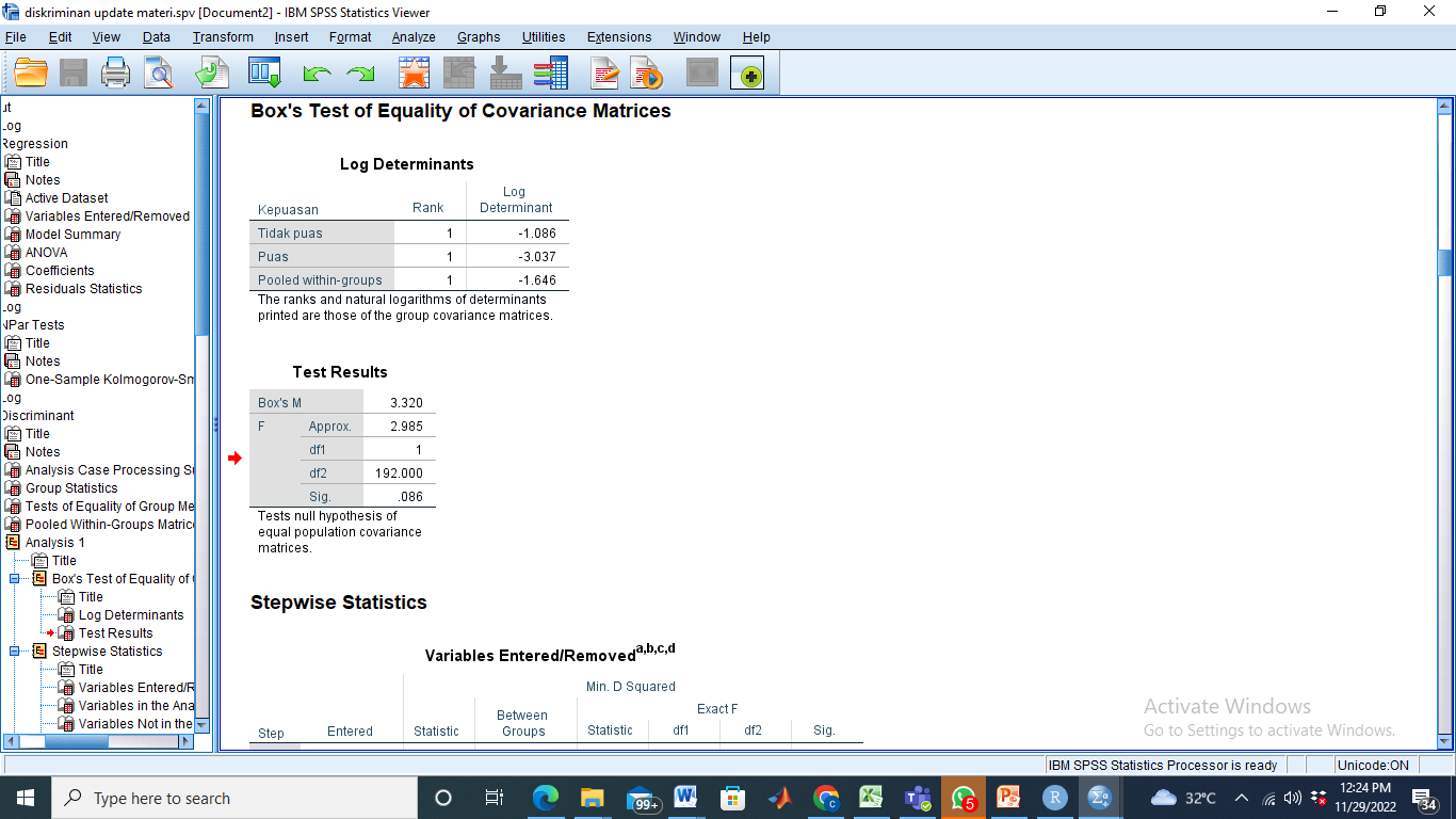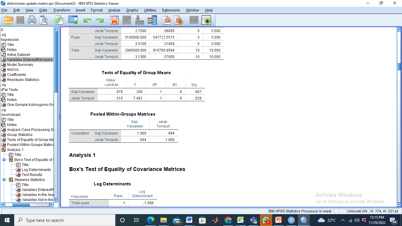 Diharapkan H0 ditolak, sehingga diperoleh bahwa variabel yang sedang diteliti memang membedakan kedua kelompok. Pada SPSS, uji ini dilakukan secara univariate (yang diuji bukan vector), dengan bantuan table Tests of Equality of Group Means.
