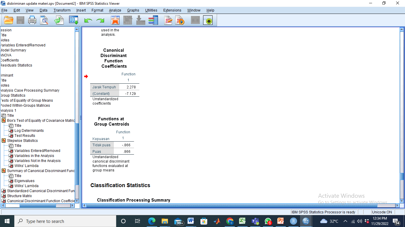 Pada output SPSS, koefisien untuk tiap variabel yang masuk dalam model dapat dilihat pada tabel Canonical Discriminant Function Coefficient. Tabel ini akan dihasilkan pada output apabila pilihan Function Coefficient bagian Unstandardized diaktifkan.
