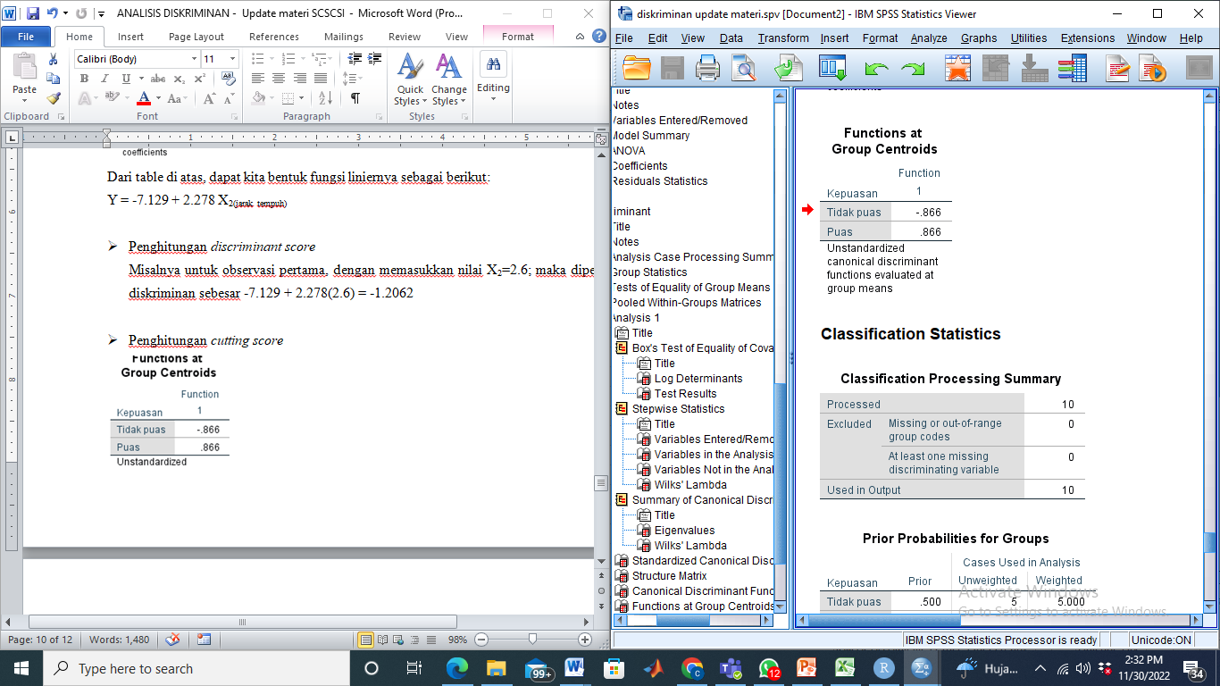 Kemudian nilai-nilai discriminant score tiap observasi akan dibandingkan dengan cutting score, sehingga dapat diklasifikasikan suatu observasi akan termasuk ke dalam kelompok yang mana. Suatu observasi dengan karakteristik x akan diklasifikasikan sebagai anggota kelompok kode 1 jika y = () ≥ m, selain itu dimasukkan ke dalam kelompok 2 (kode nol). Penghitungan m dilakukan secara manual, karena SPSS tidak mengeluarkan output m. Namun, kita dapat menghitung m dengan bantuan table Function at Group Centroids dari SPSS