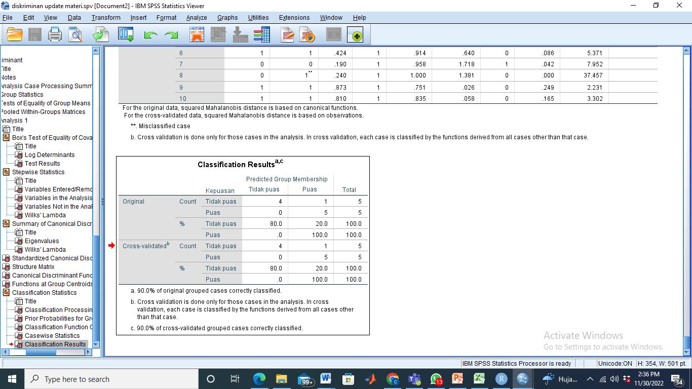 Untuk observasi pertama, karena discriminant score nya kurang dari cutting score, maka dimasukkan ke dalam kelompok kode 0 (pengklasifikasian tepat karena sebenarnya observasi pertama sebelumnya memang termasuk ke dalam anggota kelompok nol)