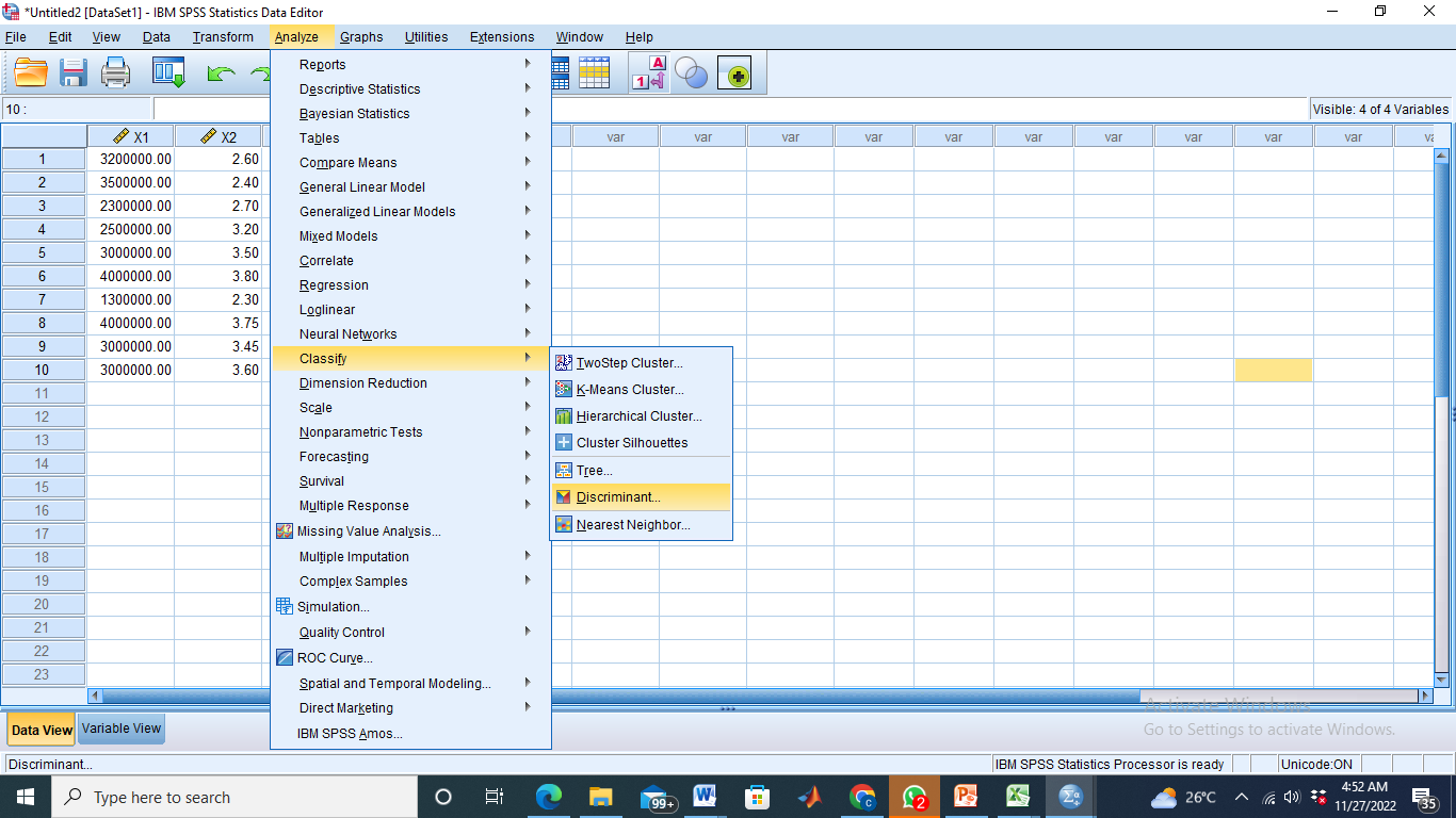 Masukkan Y ke kotak Grouping Variable, X1 dan X2 ke dalam Independents